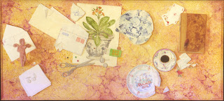 The matchbox from the restaurant overlooking the Rockefeller skating rink holds two matches - we two on our first trip together to New York; ticket stubs from the original off-off-off-off-Broadway The Night Larry Kramer Kissed Me matinee we happened to walk by one afternoon (whoda thought it, we said, in New York, showing up at the box office and getting tickets right away?); the fragment of a blue-and-white plate dug up in front of our stoop when the city was burying cable; a birth announcement - the small pink ribbon showing it to be a girl; the goose girl and her geese brought back by the Celt from a trip to a Nurnberg Christmas market and which we still set out at during the Holidays; dregs of coffee in a demitasse, part of a harlequin set we use at dinner; the ladybug, or onzelieveheersbeestje as we knew it in Holland, that landed on the print of a blue-and-white pot holding a primula auricula; a handkerchief on which sits a pair of Persian silver and mother-of-pearl cufflinks, the surfaces painted with the most delightful of scenes straight out of an illuminated manuscript; three tiny dice from a Christmas cracker that rattle still in the same ceramic box I placed them in 25 years ago; a button; a terracotta cherub that hangs each holiday from the gilded frame of a Gustavian looking glass; playing cards (strange to say, for I have an aversion to gambling and will not play any card game) one of the Queen of Hearts, the other a torn Ace of Hearts - no symbolism there, I wanted to paint a piece of scotch-tape convincingly; an airmail envelope possibly from my grandmother; coins, scissors, and a broken and much-repaired dish given to me by a now long-dead friend; a newly-bought old copy of Death Comes For the Archbishop atop which sits a Devil's Coachhorse beetle.